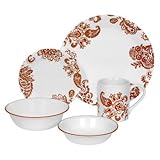 Corelle Impressions 20-Piece Set, Service for 4, includes 4 each10-1/4-inch Dinner Plates, 6-3/4-inch Bread & Butter Plates, 18- ounceSoup/Cereal Bowls, 10-ounce. Dessert Bowls, 11-ounce Stoneware Mugs, Red Paisley