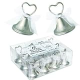 Silver Bell Place Card Holders (12 count) are made of metal with a working bell. Place Card Holders are in a heart shape with a white organza bow in the center. Holder measures approximately 2.75" high x 1.5" wide at base of bell.