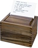 The finest looking recipe box on the market. Perfect for 6"x4" recipe cards. The slot on the top of the lid will hold a recipe card while you prepare and cook tonight's feast. Made of beautiful Acacia wood that is a hardwood that is grown on all continents. This pod bearing tree is known for its rich, dark colors, that range from gold to chocolate brown, as well as its beautiful, contrasting patterns.