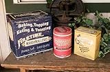 The versatility of these containers is quite unique. They are food safe so the possibilites are endless of what you can use them for. The exterior of each metal, distressed, container features vintage product labeling in Americana colors. The largest container is rectangular in shape, 12"W x 12"H x 8" deep and features Firetime Marshmallows product on a blue background. The round container has a 5-1/4" diameter and is 8" high and displays the product Snowflake Sugar. The final container has a yellow background and features Coconut. This container is rectangular and is 6-3/4"W x 8"H x 3-3/4" deep.