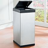 Slim rectangular trash can in shiny stainless steel fits tight spaces. Features an easy-lift, spring-loaded black plastic lid. 40-liter capacity. Fits standard 13-gallon trash bags. 23"Hx13"Wx10"D. Assembly.