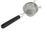 Strainer, 3-inch aluminum handle with stainless steel wire mesh. Sturdy wire frame with lips to sit securely over container. Black handle.