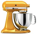 The KitchenAid Artisan stand mixer has a strong 325-watt motor delivers the power to handle the heaviest mixtures, and mix large batches easily. The 5-quart stainless steel bowl with ergonomic handle is big enough to handle large batches of heavy mixtures. Its ergonomically designed handle is contoured to fit the hand and makes lifting the bowl more comfortable. The unique mixing action eliminates the need to rotate the bowl by spinning the beater clockwise and the shaft counterclockwise, moving the beater to the edge of the bowl at 67 different points. This ensures a quick and complete mixing action. The Artisan Stand Mixer includes a 1-piece pouring shield, flat beater, dough hook, and wire whip which will add to the versatility of the mixer.