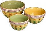 Inspired by Jana Kolpens book about a French farmhouse, Pfaltzgraff Pistoulet tableware has a spontaneous rustic charm that enhances the pleasures of cooking, eating, and conversing. These three nesting bowls, crafted from durable stoneware, add equal parts utility and joy to mixing and serving jobs. Each bowl features a soft yellow exterior ornamented with a row of freely rendered and very cheerful sunflowers standing at attention. Two of the bowls have bright yellow interiors; the third sports a soft green wash inside. Maroon banding and hash marks add definition and liveliness. Safe in the dishwasher, microwave, and freezer, the bowls measure 6-3/4, 8, and 9-3/4 inches in diameter, respectively. Pfaltzgraff includes a 3-year warranty against defects. --Emily Bedard