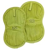 Established in 1892, the John Ritzenthaler company (Ritz) has long been synonymous with the finest quality in home textiles. Calphalon is a name equated with quality in the kitchen. This set of 2 green Calphalon potholders is made with 100% heavy weight cotton twill. This stain resistant fabric is covered with silicone for great grip control and is heat resistant up to 500°. The pot holder shape provides the right amount of protection without extra bulk and can be used with a right or left hand. Silicone treated fabric allows for great grip control when handling heavy pots and pans and is highly flexible, breathable and tear resistant. Each green pot holder measures 10 inches long and 6 inches wide. Machine wash cold, tumble dry low and remove immediately from the dryer.